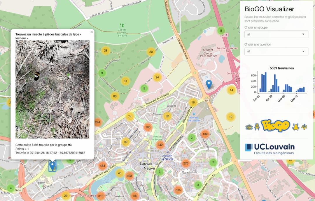 BioGO (comme dans PokemonGO) est une chasse au trésor biologique à grande échelle que nous avons créée pour nos étudiants. Le principe est simple. Nous avons dressé une liste de plus de 250 « quêtes » à retrouver à Louvain-la-Neuve (la ville Université catholique de Louvain est basé en). Ces quêtes étaient toutes liées à des structures et organismes biologiques, à la fois botaniques et zoologiques. Voici quelques exemples: