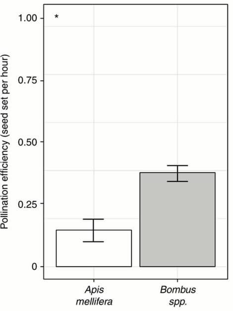 "Avec les niveaux actuels de performance des abeilles, les plantes devraient produire trois fois plus de fleurs, ou les abeilles devraient doubler leur fréquence de visite, pour atteindre une production de graines par heure aussi élevée que celle atteinte par les bourdons indigènes. les abeilles."