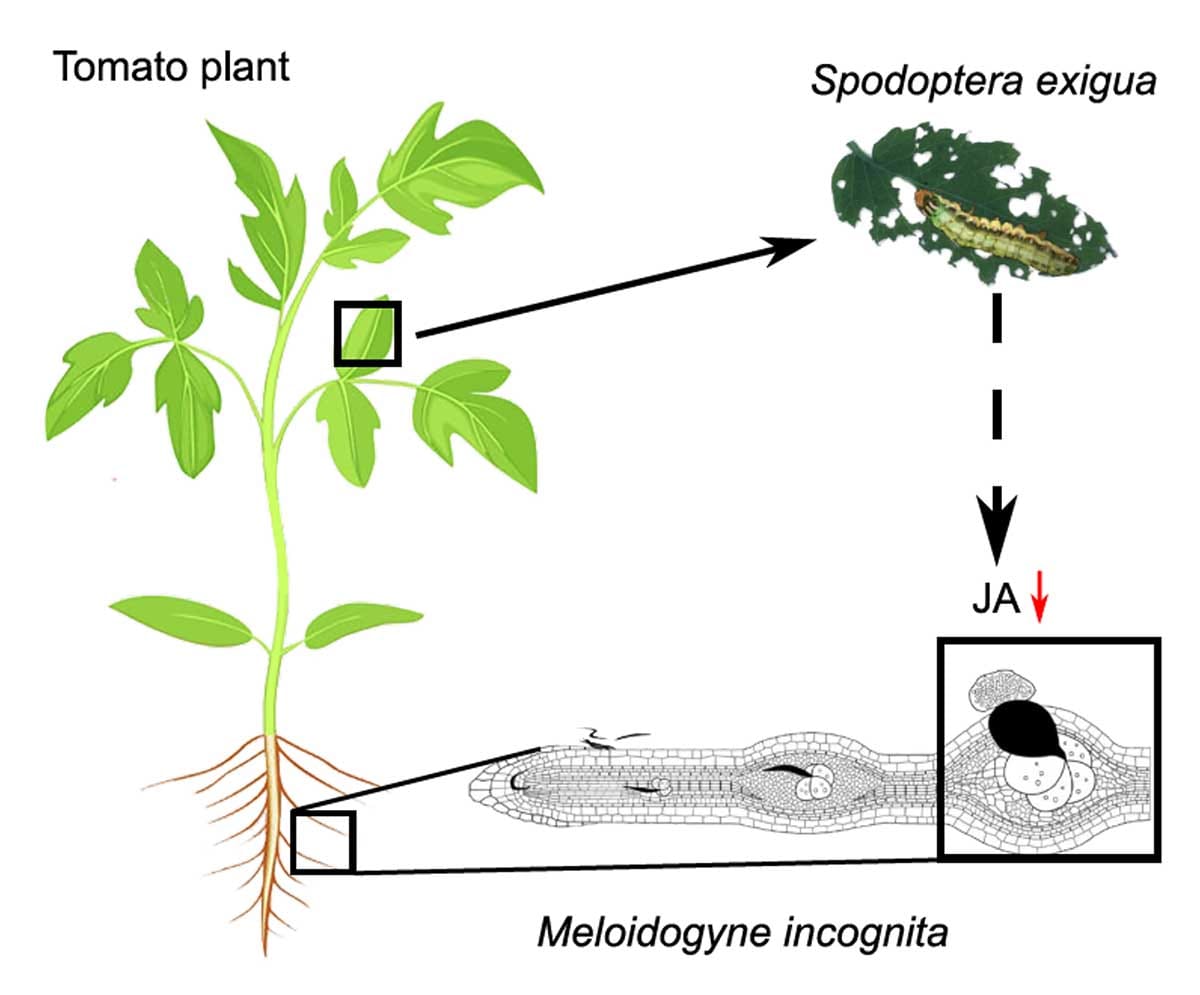 Les nématodes à galles (RKN) sont des parasites des plantes qui endommagent les racines de la plante hôte. L'infection RKN entrave le mouvement de l'eau et des minéraux des racines aux pousses, ce qui peut limiter la productivité et la forme physique des plantes. Alors que les racines sont infestées par des nématodes souterrains, les feuilles des plantes au-dessus du sol peuvent être attaquées par des insectes herbivores, tels que les chenilles. La perte de matériel foliaire due à l'alimentation des chenilles peut également avoir un impact négatif sur la productivité des plantes. Ensemble, les dégâts causés par le RKN et les insectes herbivores peuvent réduire la production agricole de 20 %. Les pesticides peuvent être utilisés pour lutter contre ces ravageurs, mais bien qu'ils soient souvent efficaces, ils peuvent avoir des effets négatifs sur la santé humaine et environnementale. Les efforts visant à identifier les traits naturels de résistance des plantes à ces ravageurs et l'interaction entre le RKN et les chenilles peuvent nous aider à développer des stratégies durables de lutte antiparasitaire.