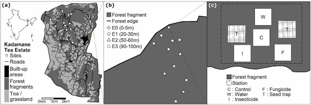 Krishnadas et ses collègues ont mis en place des expériences dans le hotspot de biodiversité des Ghâts occidentaux, Karnataka, dans le sud de l'Inde, où 60 % du paysage de 3,600 15 ha est fragmenté en raison des plantations de thé, des routes et des prairies. Les chercheurs ont sélectionné 0 emplacements et ont appliqué soit un fongicide, soit un insecticide, soit de l'eau ou aucun traitement à différentes distances de la lisière de la forêt (5–20 m, 30–50 m, 60–90 m et 100–292 m) et ont installé 730 semences pièges et surveillé XNUMX parcelles de semis.