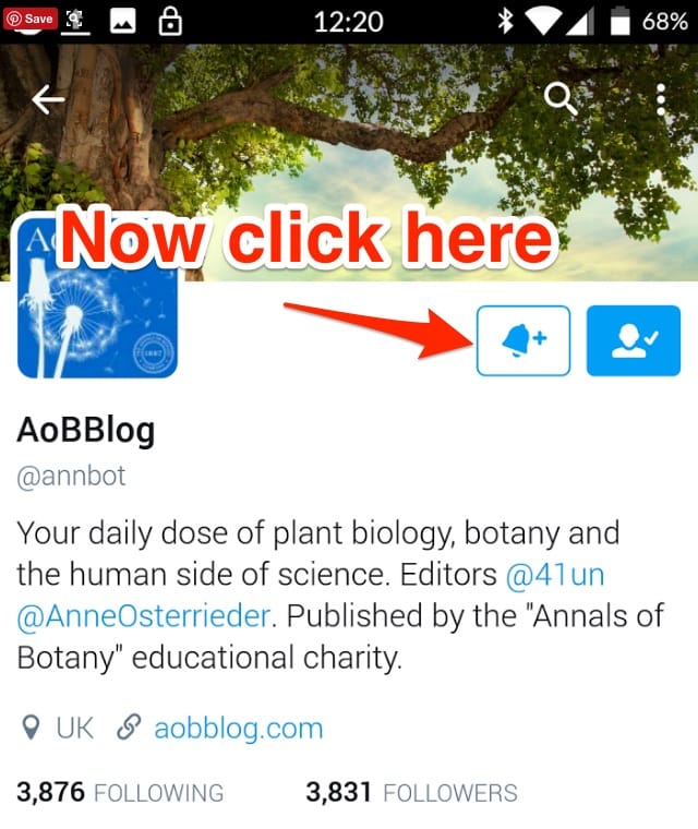 Sur votre mobile, une fois que vous avez suivi un compte Twitter, vous verrez apparaître un ou deux boutons supplémentaires . Pour activer les notifications, cliquez sur le qui ressemble à une cloche. Cela fera apparaître un menu dans lequel vous pourrez choisir les notifications à activer. En sélectionnant les notifications pour "Tous les Tweets", je recevrai désormais des notifications sur mon téléphone de la même manière que je recevrais une notification par SMS ou par e-mail. Chaque nouveau billet de blog sur AoBBlog est annoncé par des mises à jour sur les réseaux sociaux, donc en suivant ces étapes, vous vous assurerez de ne jamais manquer un autre billet !