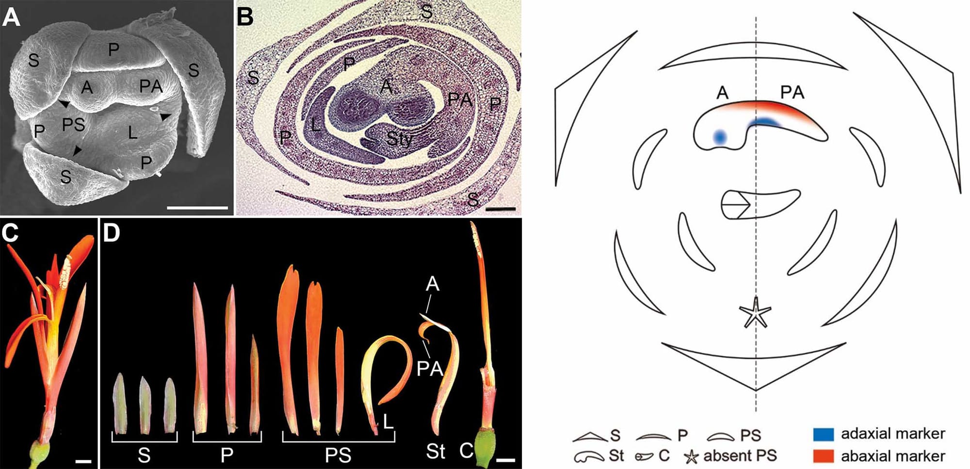 Dans leur nouvelle recherche publiée dans AoBP, Tian et al. examiner le processus dynamique d'établissement de la polarité adaxiale-abaxiale dans l'étamine asymétrique de canna indica. L'étamine de C. indica comprennent une anthère à une thèque et un appendice pétaloïde. Les auteurs ont utilisé deux gènes des familles HD-ZIP III et YABBY comme marqueurs respectivement adaxial et abaxial et ont testé leur expression avec de l'ARNm. sur place hybridation. Les auteurs ont constaté que la polarité de l'étamine changeait de façon irrégulière au cours du développement. Ils ont conclu que cela était responsable de la séparation des deux microsporanges au sein de l'anthère, de l'enroulement vers l'intérieur de l'appendice pétaloïde et, finalement, du développement asymétrique des fleurs. Ces résultats fournissent des données fondamentales pour comprendre la structuration irrégulière des étamines de C. indica.