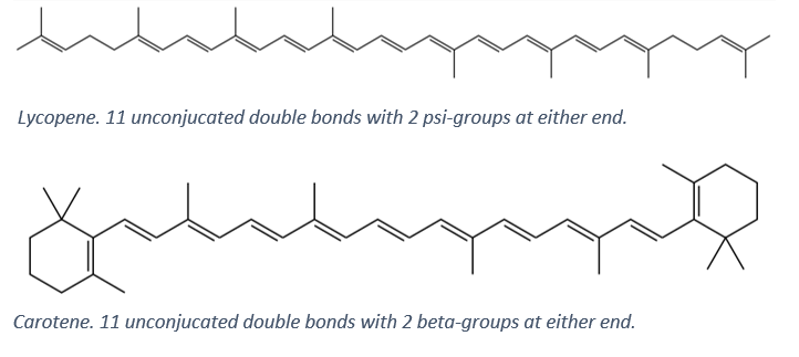 Le lycopène est un pigment caroténoïde rouge vif. Il est présent dans de nombreux fruits et légumes, et les tomates sont l'une des sources les plus riches de ce composé phytochimique (Wert, 2009). La structure du lycopène est très similaire à celle du carotène, sauf qu'il a un groupe psi-terminal aux deux extrémités (Figure 1). Lorsque l'enzyme lycopène bêta-cyclase agit à une extrémité, l'enzyme forme du gamma-carotène (Araya Garay et al. 2011). En agissant aux deux extrémités, il forme du bêta-carotène. Le bêta-carotène est le pigment responsable de la couleur orange des carottes.