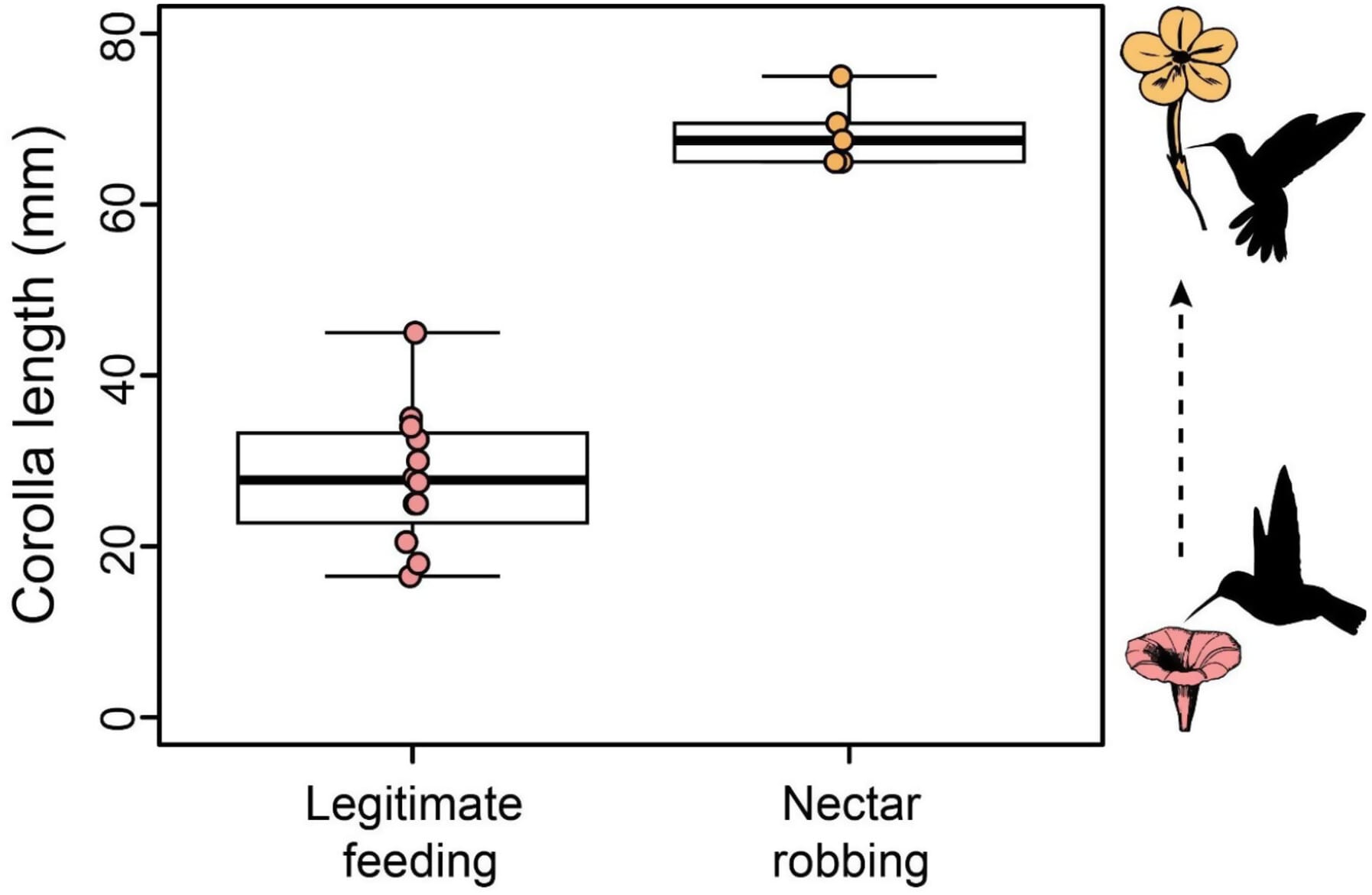 Les chercheurs ont découvert que le colibri à queue métallique noire, en raison de son bec court, se livre fréquemment à des vols de nectar, où il perce les fleurs pour accéder au nectar sans les polliniser. Ce comportement est fortement associé aux fleurs dont la corolle est beaucoup plus longue que le bec de l'oiseau. Lorsque les fleurs sont trop longues pour que le colibri à queue métallique noire puisse atteindre le nectar par une pollinisation légitime, l'oiseau a recours au vol de nectar. Cependant, le colibri à queue métallique noire utilise sa stratégie de pollinisation typique lorsque les fleurs sont plus courtes, car son bec peut facilement atteindre le nectar. Ces résultats suggèrent que la longueur de la corolle des fleurs est essentielle au comportement de vol de nectar.