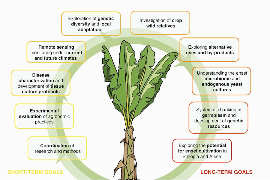 L'examen se termine par une liste d'autres sujets de recherche nécessaires pour comprendre et développer l'ensète. Le changement climatique, évidemment, est un problème. Borrell a déclaré: «L'Éthiopie a déjà connu un réchauffement de 1.3 ° C et l'ensète est une culture des hautes terres qui bénéficie d'un climat relativement frais - au moins aussi frais que possible à 7 ° au nord de l'équateur. Cela signifie que dans certaines régions, il est déjà stressé et que les agriculteurs observent des changements. » Une culture qui pousse déjà dans les hautes terres ne peut se déplacer qu'aussi loin vers le haut.